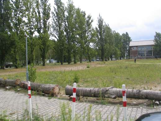 Kasernen in der Umgebung z. T. noch vorhanden, seinerzeit von Mauern umgeben, an die Ostfassade, dort, wo nach Abriß die Baumreihe sichtbar ist, hatte man das besagte Poster von 50 qm angebracht